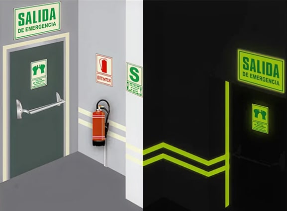 - Fotoluminiscente y reflectiva para visibilidad en oscuridad total.